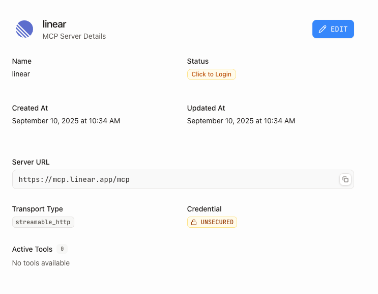 - Status - healthy, unhealthy, unknown, disabled, or shows a "Click to Login" button if OAuth 2.1/PKCE flow is detected